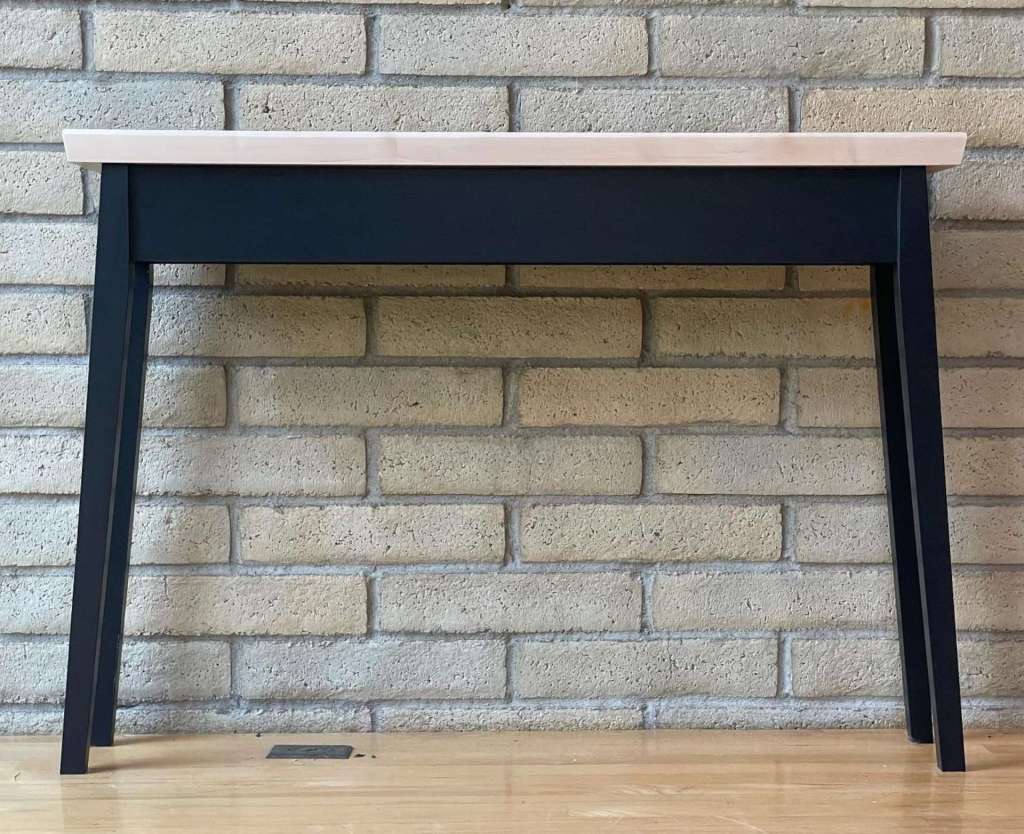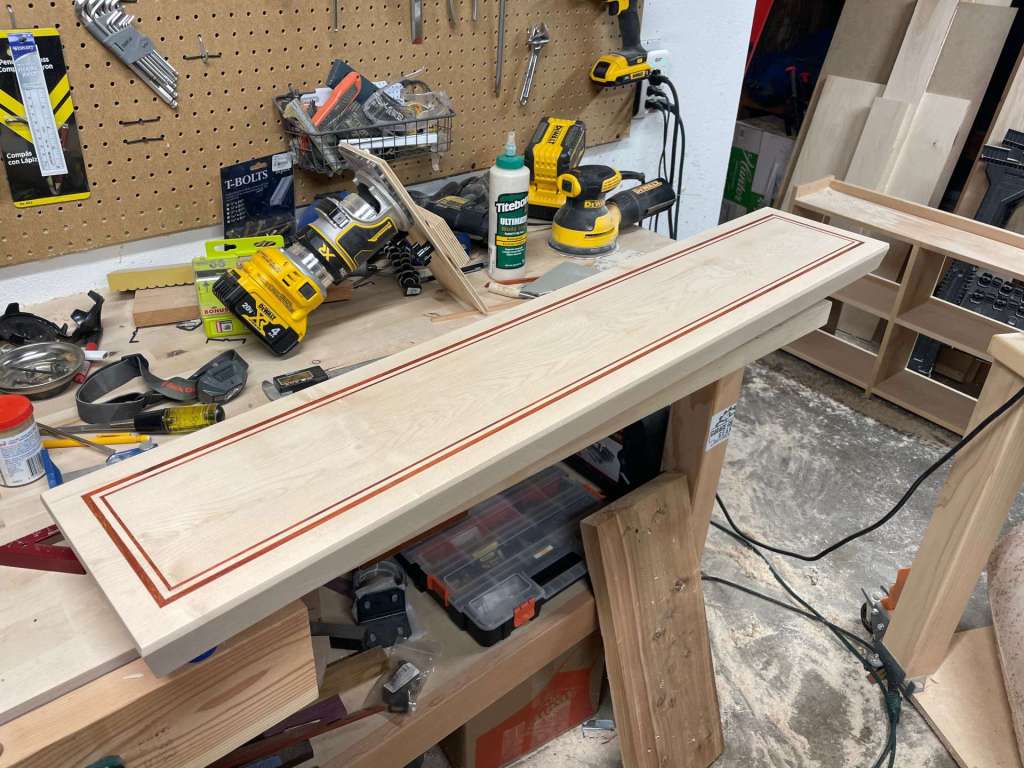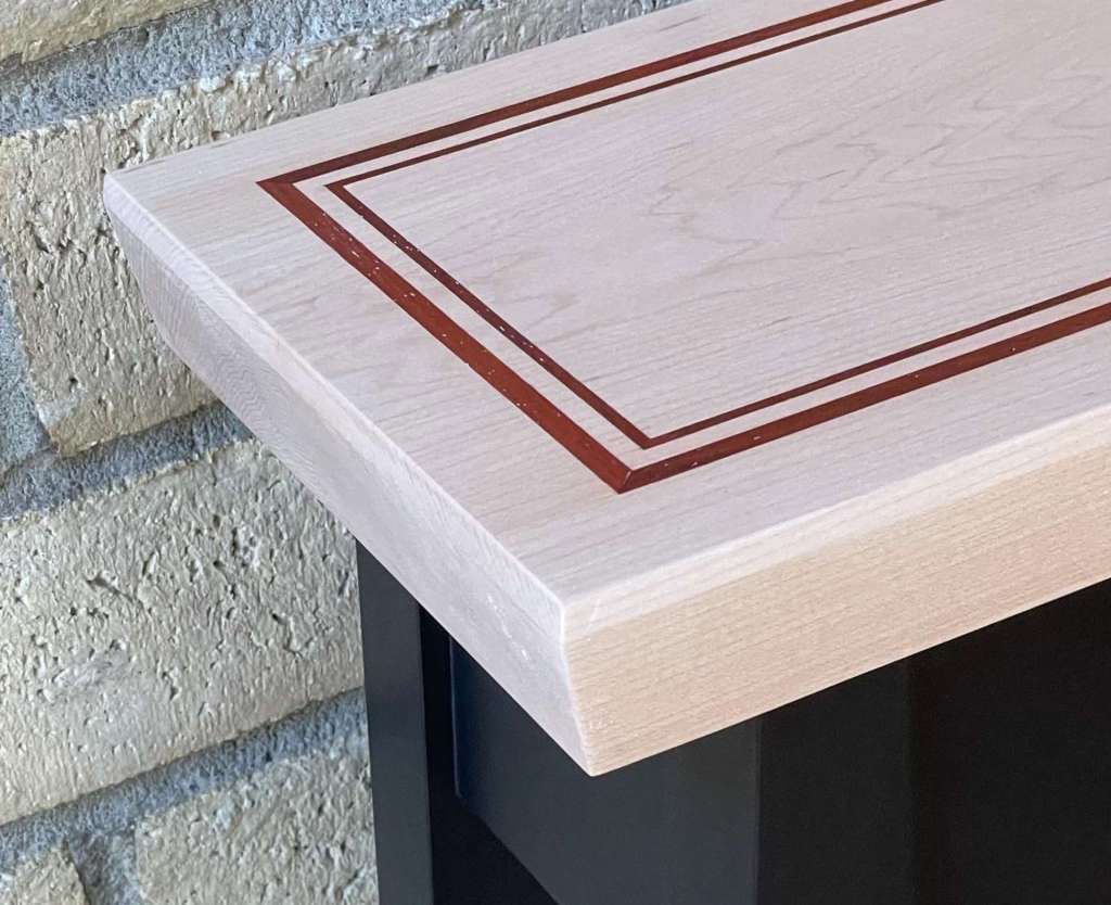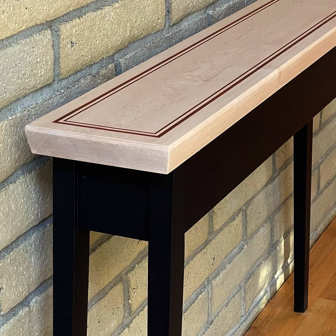 Maple, with padauk inlay and black painted poplar legs. My second attempt at inlay, and I think it came out pretty well, if I do say so myself.